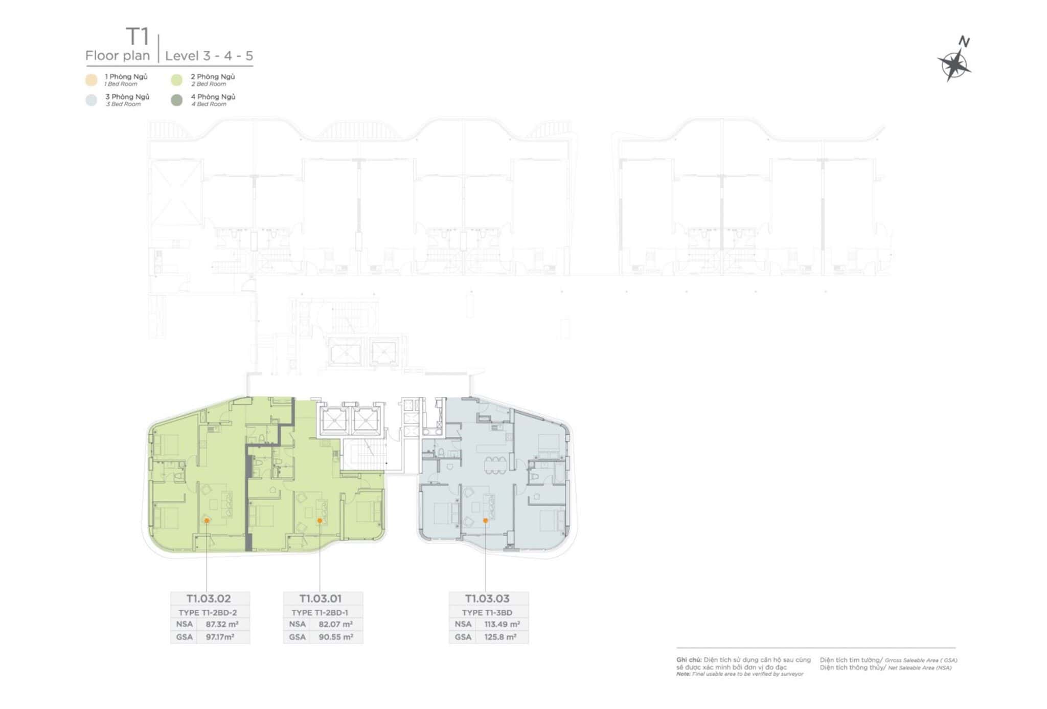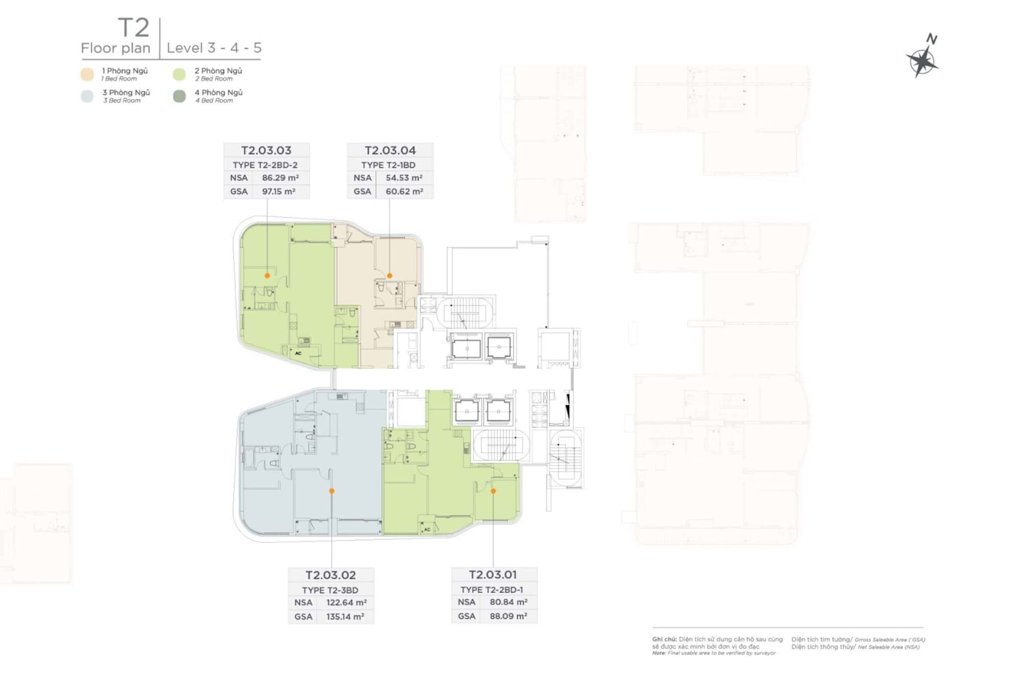 - Tầng 3–5: Mỗi tầng 3 căn (2 căn 2PN, 1 căn 3PN)