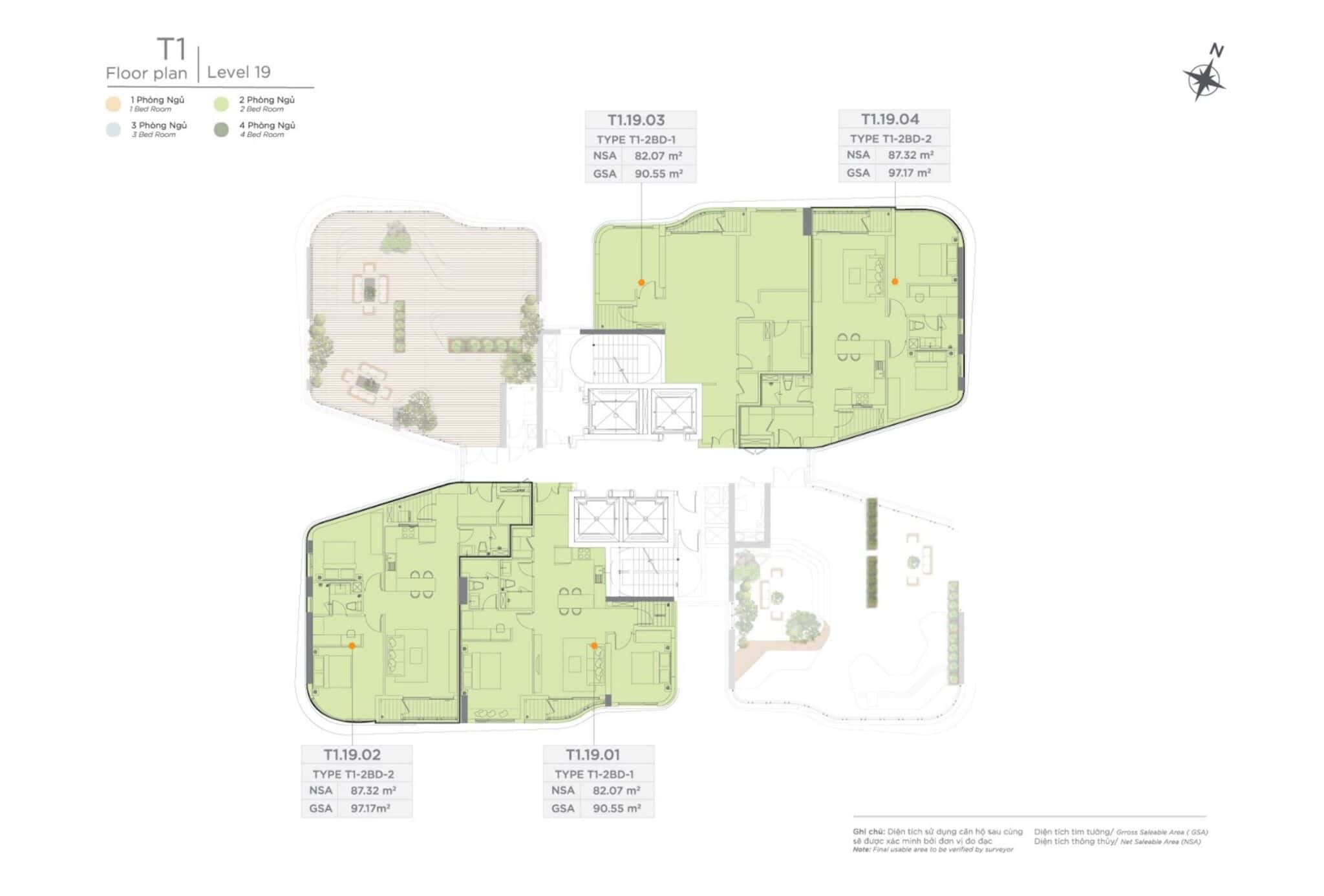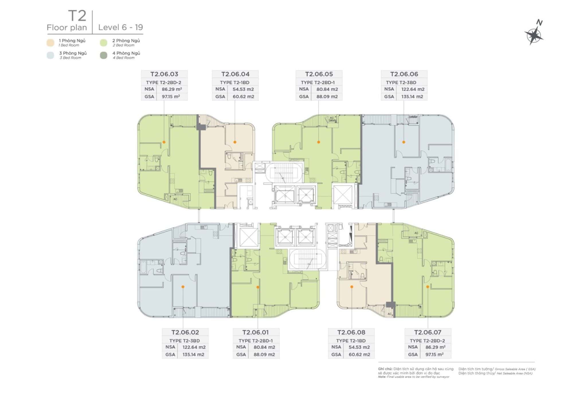 - Tầng 6–19: Mỗi tầng 8 căn (4 căn 2PN, 4 căn 3PN)