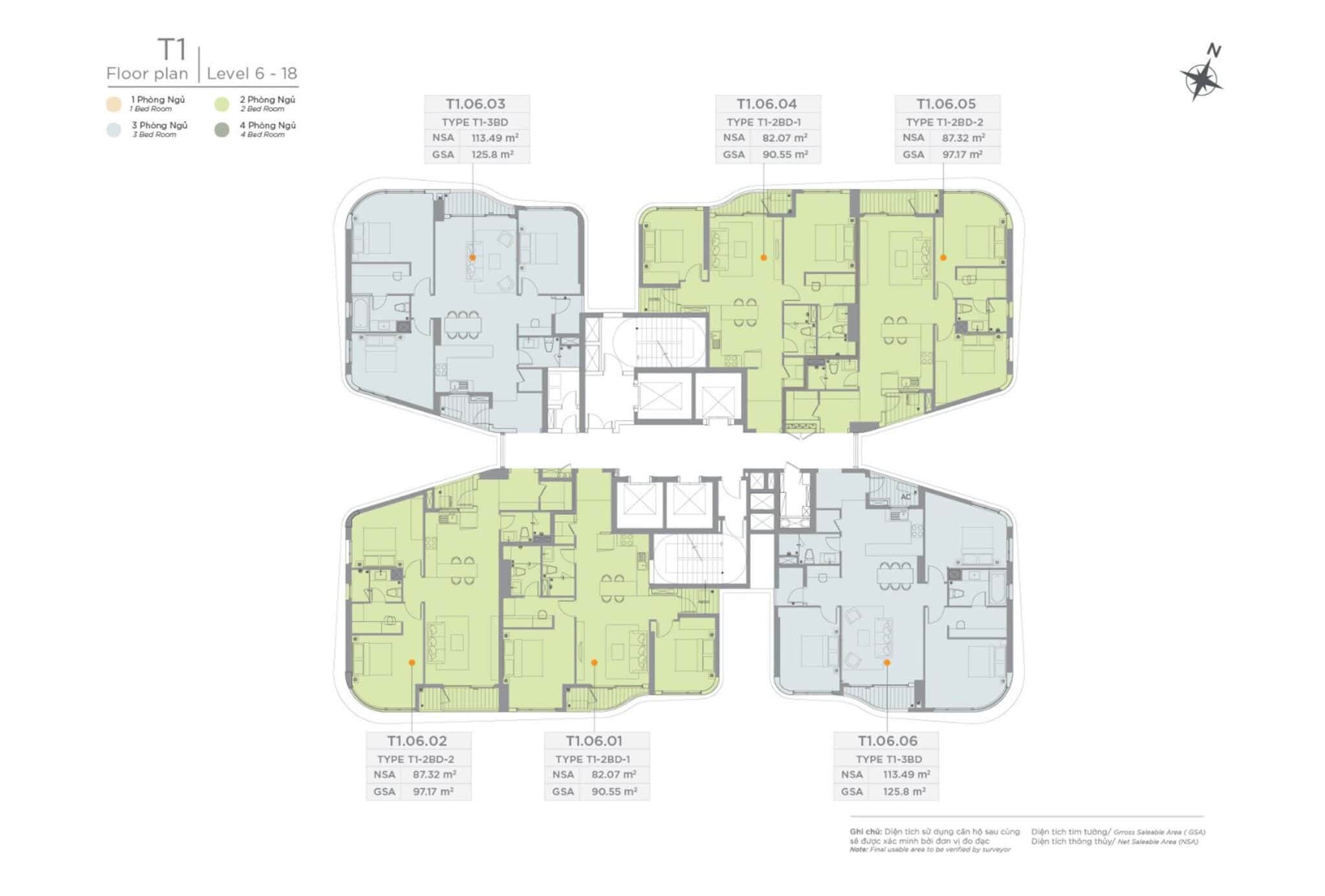 - Tầng 6–18: Mỗi tầng 6 căn (4 căn 2PN, 2 căn 3PN)